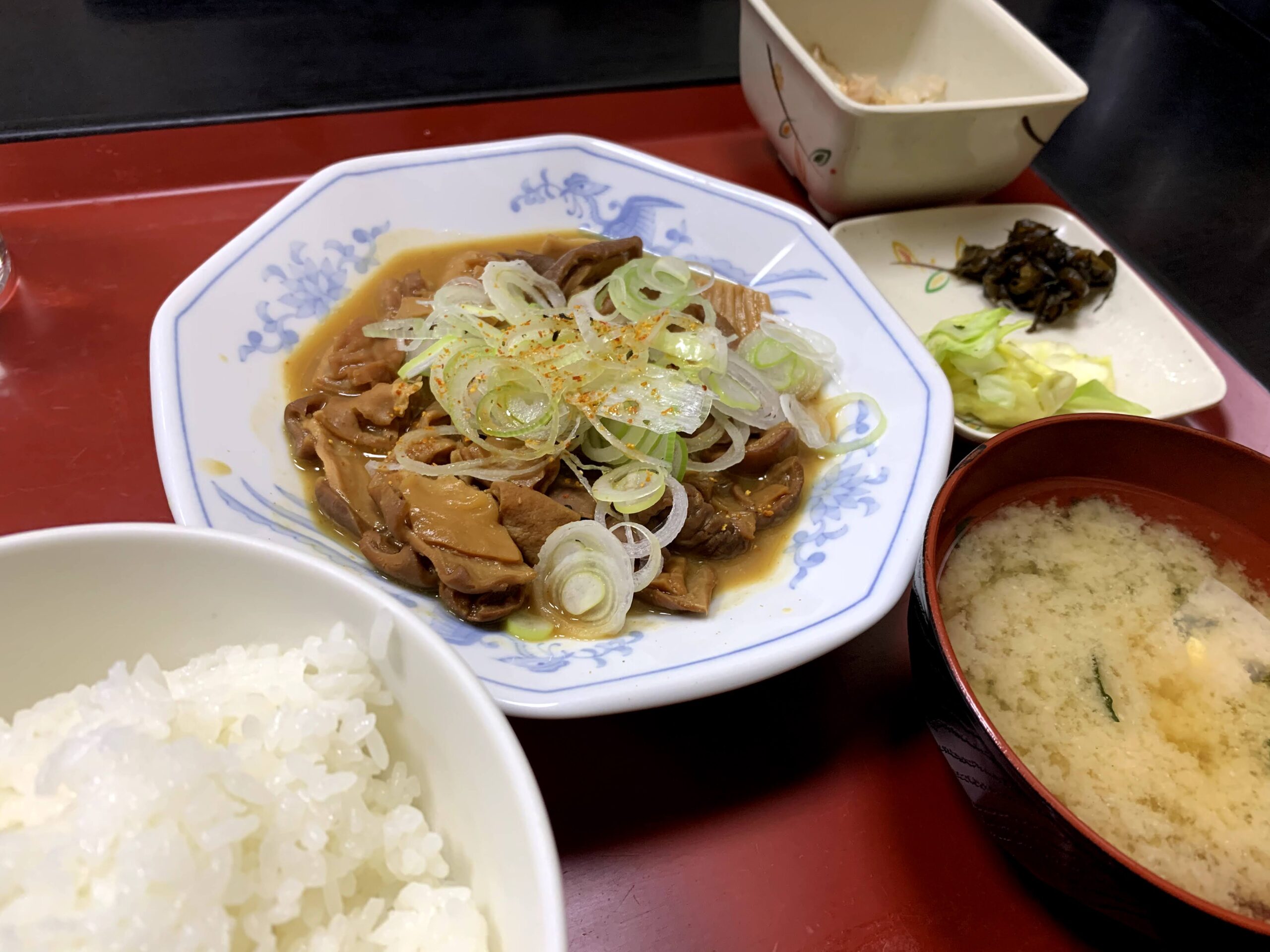 ↑味染み染みで柔らかい、ご飯が進むもつ煮込み定食!