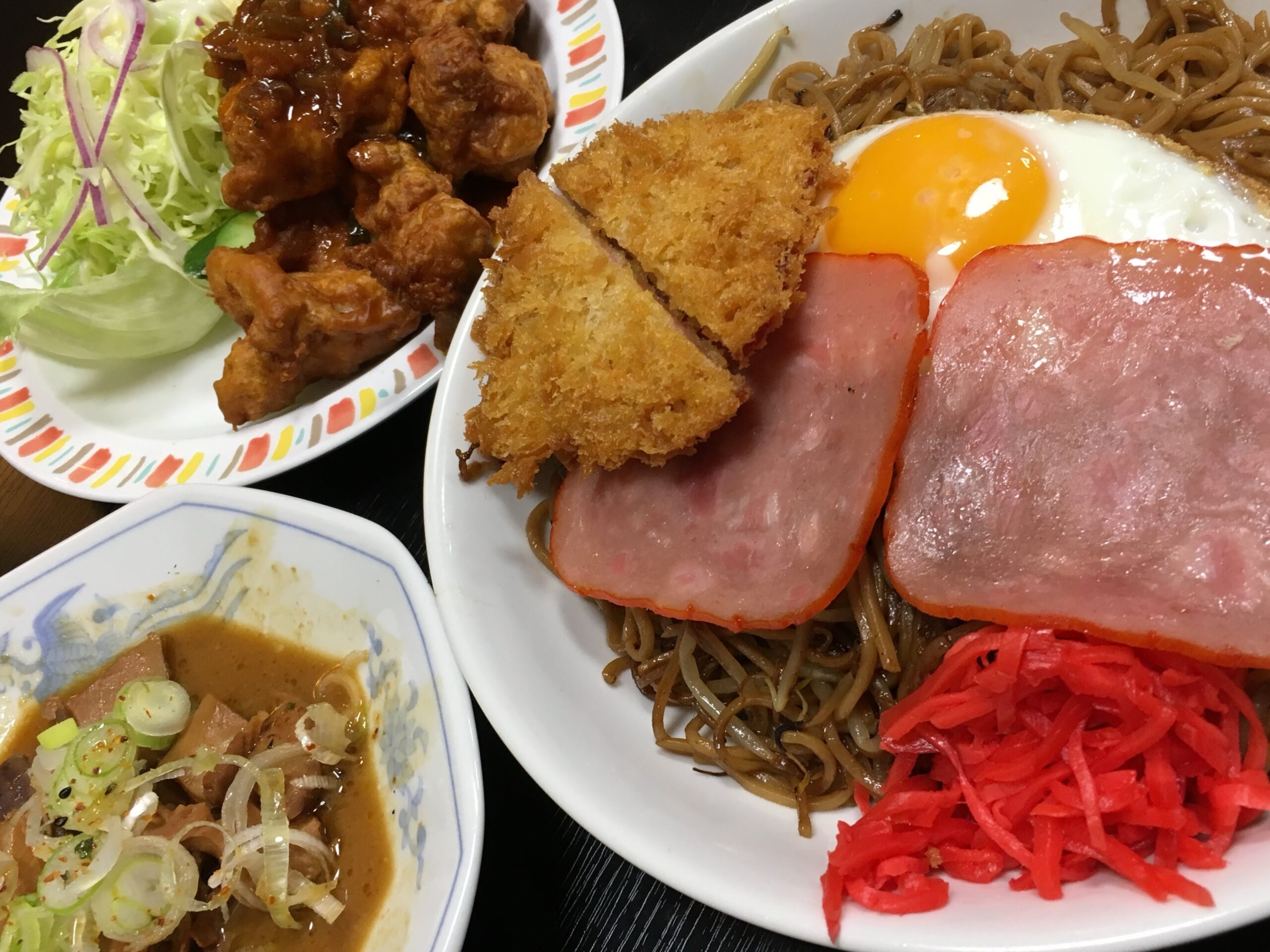 石巻焼きそばMにハムカツ、ハムエッグトッピング+からあげ(単品)+もつ煮込み(単品)!