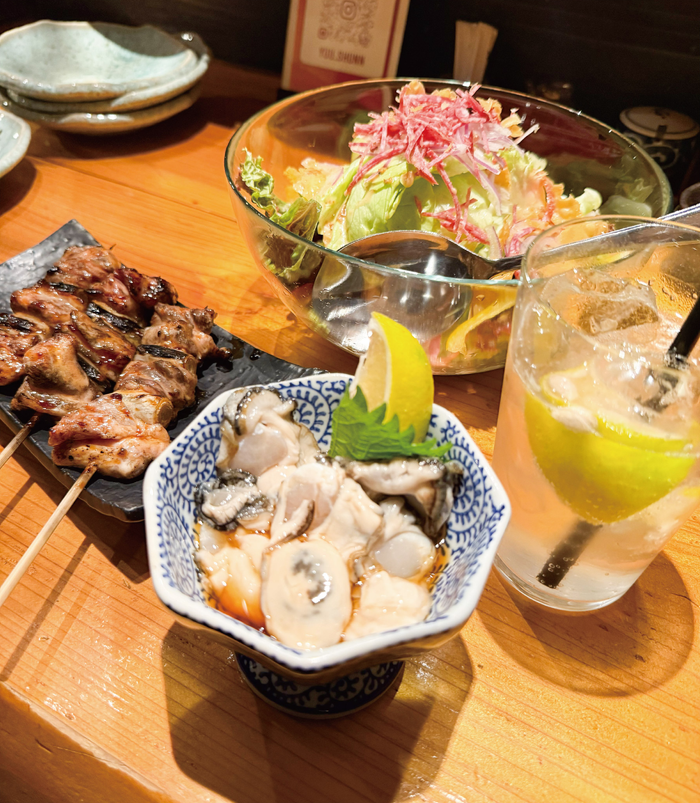 この日は、旬の生牡蠣と焼き鳥、遊旬サラダ、人気のキムチチャーハンをいただきました。