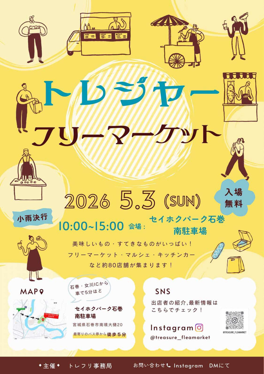 「トレジャーフリーマーケット」が、2026年5月3日にセイホクパーク石巻の南駐車場で開催されます。